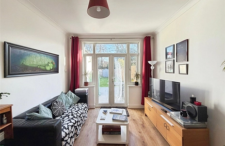 The flat features a separate reception room with direct access to a private large garden, a notable benefit for a property of this type and location. The kitchen includes wood countertops and is arranged to make effective use of the space. The bedroom is a large double with bay windows, allowing for good natural light and a pleasant outlook. The bathroom offers a three-piece suite with natural light.