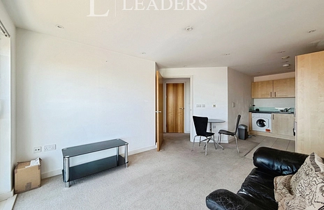 The accommodation comprises a generous double bedroom, a contemporary bathroom, and a bright open-plan living/kitchen area designed for both comfort and functionality. The living space is complemented by a Juliet balcony, allowing for a light-filled interior and far-reaching outlook across the cityscape.