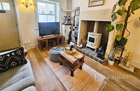 The property is entered via a solid wood front door into a welcoming lounge that retains much of its traditional character. A Belper fireplace with stove forms a central focal point, complemented by a renovated sash window with shutters to the front elevation, allowing plenty of natural light while maintaining the cottage’s period feel. The room is finished with quality wood-effect laminate flooring and also benefits from a useful under-stairs storage cupboard and a bespoke, made-to-measure meter cupboard.