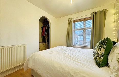 The double bedroom is enhanced by an attractive archway leading through to a dedicated wardrobe/storage area, adding character as well as practicality. The bedroom also features a window to the front.