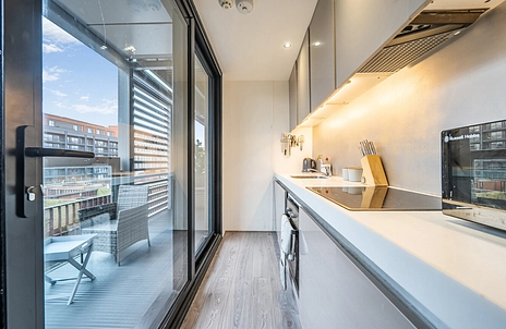 The apartment includes a sleek, modern shower room with high-quality finishes.