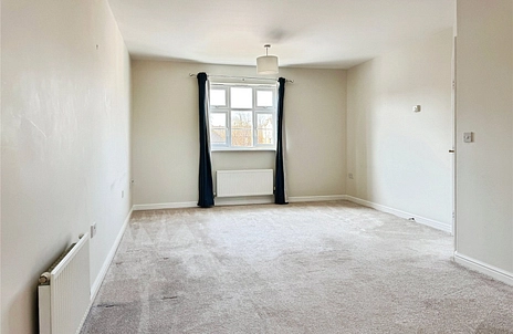 A well-proportioned open plan living and dining area with a front-facing double glazed window allowing for natural light. The room is fitted with two radiators and offers a comfortable layout for both seating and dining, flowing through to the kitchen.