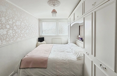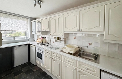 The property features a separate reception room with large windows, providing good natural light and a defined living and dining area. The kitchen also benefits from natural light, creating a bright workspace for everyday cooking. There are two double bedrooms; the main bedroom includes built-in wardrobes, maximising storage and floor space. The bathroom is fitted with a walk-in shower.