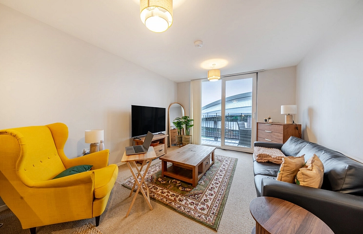 The apartment is well proportioned throughout and offers a welcoming atmosphere. Off the entrance hall, you’ll find a generously sized reception room with sliding doors opening onto the balcony, along with a modern open-plan kitchen fitted with a range of wall and base units.