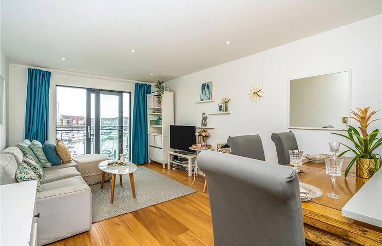 distinguished interiors. The apartment boasts an approximate lease length of 112 years, 710 square foot internal accommodation, allocated under croft parking, South facing walk on balcony/separate Juliet balcony and a modern en-suite shower room/three piece bathroom suite. Entering into the apartment you are welcomed into a wooden floor entrance hall with crisp white walls, LED spot lighting and a useful storage cupboard. The modern living lounge/kitchen/dining room enjoys a fashionable way of life with spaces that flow effortlessly, white gloss profile kitchen with built in appliances, Juliet balcony or simply spend an evening curled up on the sofa marvelling at a view that lends a wonderful sense of place. The generously sized second bedroom promotes south facing marina views, along with a floor to ceiling window. The liberally sized master bedroom benefits from a tasteful en-suite shower room a fitted wardrobe and balcony access where you can take in the sea air and starry nights. The apartment also comprises of a floor to ceiling tiled bathroom suite, secure telephone entry system, gym member ship and viewing is certainly advised to appreciate all aspects of this marina home.