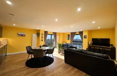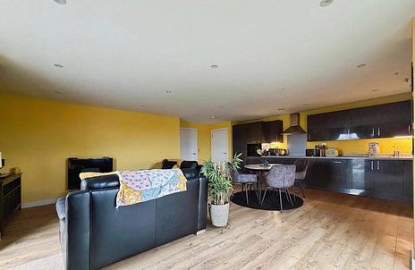 The property features an open-plan kitchen/reception room with built-in appliances, creating a practical space for cooking, dining and relaxing. This room gives access to a balcony, extending the living space outdoors. The main double bedroom benefits from an en-suite and access to a large balcony, providing additional private outdoor space. The second bedroom is also a double, suitable for guests, working from home or additional storage needs. A separate bathroom includes a three-piece suite and heated towel rail.