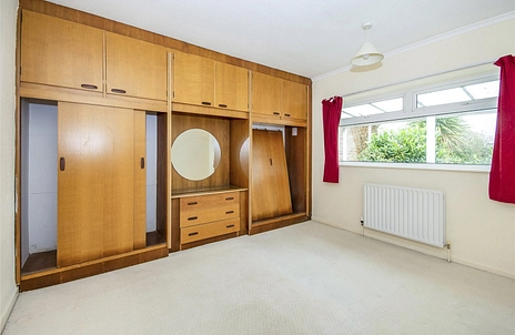 Located at the rear of the property, bedroom one features a double-glazed window overlooking the garden, fitted wardrobes, built-in cupboards with shelving and a radiator for heating.