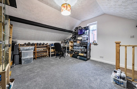 Accessible from the first-floor landing via a pull-down ladder. The loft room includes a side-elevation double-glazed window, carpeted flooring, lighting, electrical points and heating. Measuring approximately 5m x 3m, it offers a versatile space currently used as a hobby room.