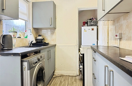 Fitted with a range of wall and base units with work surfaces over, incorporating a one bowl sink with mixer tap and drainer. Space for white goods, tiled splashbacks, and a radiator. Opening through to an additional room providing further storage and space for appliances, including fridge freezers.