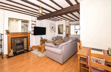 Currently utilised as a dining area, this room continues the wood-effect flooring and exposed beams, creating a cohesive feel. A decorative fireplace provides a focal point, and there is access through to the kitchen.