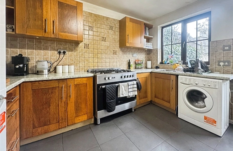 Fitted with a range of matching wall and base units with work surfaces over, the kitchen also benefits from a breakfast bar area. There is an five ring gas cooker with oven, sink with drainer positioned beneath the rear window, and space for appliances including plumbing for a washing machine. A door provides access to the rear garden, with an additional internal door leading to the bathroom.