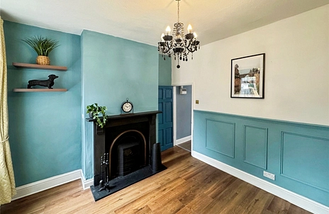 Upon entering the property through the front door, you are welcomed into the first reception room. This inviting space features an open fireplace, a built-in under-stairs storage cupboard, picture rails, a double-glazed window to the front elevation, and a radiator.