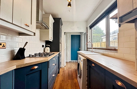 The modern fitted kitchen comprises a range of wall and base units with rolled-edge work surfaces, a Belfast sink, five-ring gas hob with extractor hood, integrated raised electric oven, and space for further appliances. There is a uPVC door providing access to the rear garden, and a double-glazed window to the side elevation.