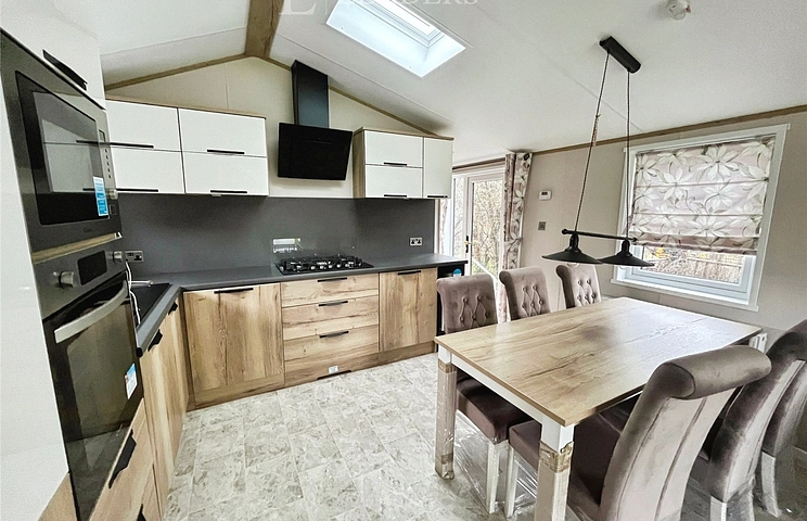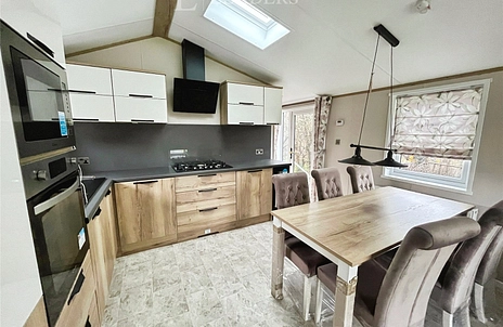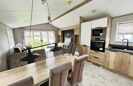 The sleek, fully fitted kitchen boasts brand new appliances including a full-size oven and integrated fridge freezer, with generous worktop space, a breakfast bar for two and a dining area for four. Set on an open, sunny plot the Ovation Lodge combines contemporary style with comfort, making it an ideal retreat for weekends away or long-term living.