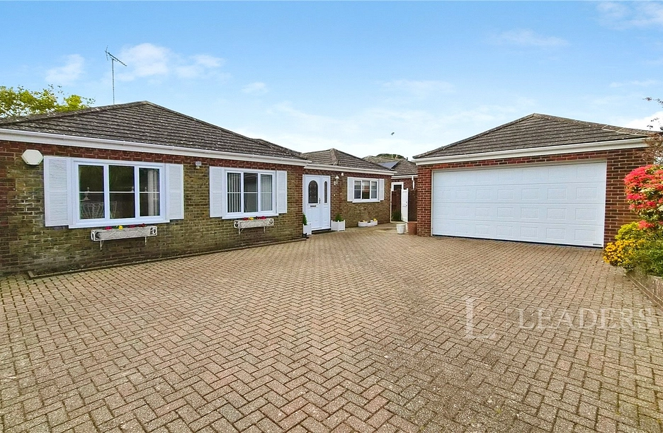The property is approached via wrought-iron gates, set within a brick boundary wall, onto a paved driveway which extends to the side of the home leading to the generous double garage at the rear. There is ample space to park several vehicles and for boat storage, if required. High-level evergreen hedging borders the drive and provides privacy to an area of lawn. There is direct access to the outside from the living room and from the principal bedroom.