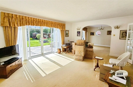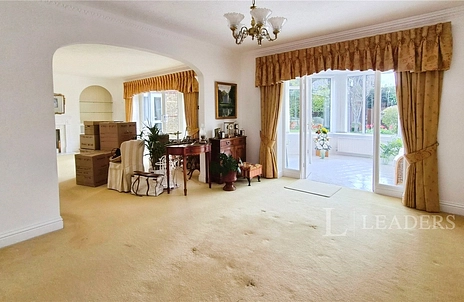 The property is approached via wrought-iron gates, set within a brick boundary wall, onto a paved driveway which extends to the side of the home leading to the generous double garage at the rear. There is ample space to park several vehicles and for boat storage, if required. High-level evergreen hedging borders the drive and provides privacy to an area of lawn. There is direct access to the outside from the living room and from the principal bedroom.