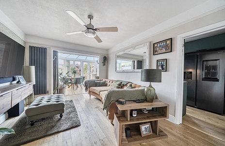 The home has been thoughtfully renovated with family life in mind. The ground floor centres around a stunning, newly fitted matte green kitchen, complete with breakfast bar and high-quality integrated appliances including Bosch cooking appliances, AEG dishwasher, Hoover washer/dryer, wine cooler and a Samsung American-style fridge/freezer with water and ice dispenser. This space flows into a bright open-plan living area, ideal for family time and entertaining, while engineered oak flooring throughout the ground floor adds warmth and durability.