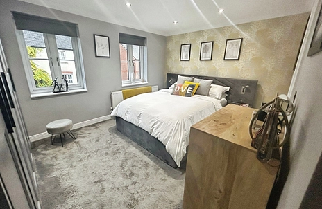 A generous double bedroom with double-glazed window to the front elevation, fitted wardrobes, and radiator.