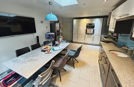 A superb open-plan space comprehensively fitted with a range of modern wall and base units, extensive work surfaces, and circular sink with mixer and filtered water taps. Integrated AEG appliances include a double hob and circular extractor. Cathedral-style skylight and inset spot lighting enhance the natural light, while double bi-fold doors open directly to the rear garden. Finished with tiled flooring, a heated towel radiator, and ample space for dining and entertaining.
