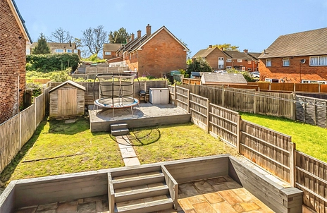 The rear garden is attractively arranged over tiers, beginning with a patio seating area, leading to a lawned space, and continuing up to a further section that is the designated play area, ideal for families with children.