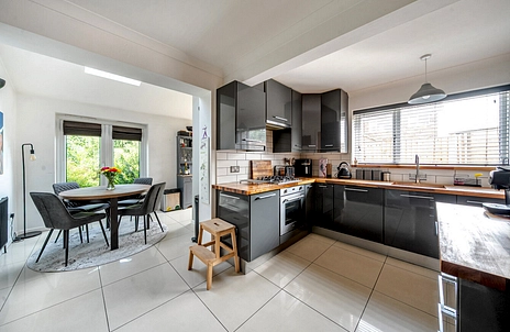 The contemporary IKEA kitchen is fitted with a modern range of wall and base units, topped with walnut work surfaces, and complemented by an undermounted ceramic sink. It includes integrated Smeg appliances, including a dishwasher and oven, a gas ring hob with extractor, and a separate island offering further cupboard space. A generous walk-in cupboard provides ideal storage or pantry use. A side-facing window brings in additional light, and the kitchen opens directly into the extended dining area – complete with Velux roof window and French doors to the garden – creating an ideal setting for everyday dining and entertaining.
