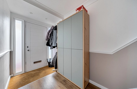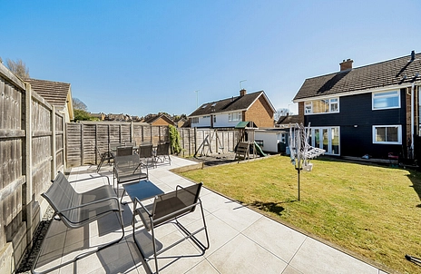 Step into a bright and welcoming entrance hall with generous storage, leading through to a spacious reception area ideal for both relaxing and entertaining. The property boasts a sleek, fully integrated open-plan kitchen with a clean, modern finish and a practical layout, complemented by an ample dining area and French doors opening onto the rear garden.
