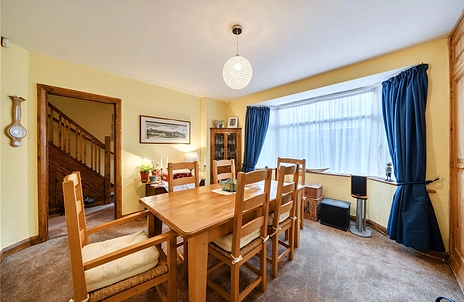 To the front, a stunning bay-fronted dining room provides an elegant setting for entertaining, complete with a striking feature fireplace that adds warmth and character.