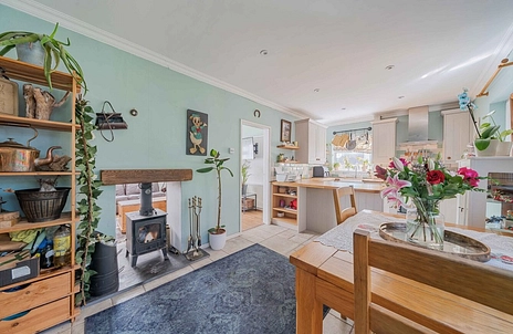 Fitted with a range of wall and base level units with work surface over, sink unit with side drainer and mixer tap, tiled splashbacks, integrated oven with hob and extractor over, plumbing for washing machine, space for fridge freezer, central heating radiator, window to the side aspect and door leading into the conservatory.