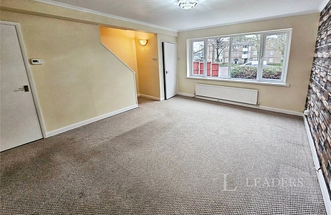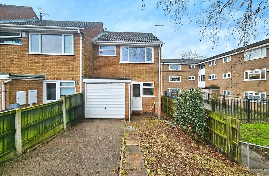 A well-proportioned three-bedroom end townhouse, offering generous accommodation and excellent parking facilities, including driveway parking and a garage positioned to the rear, along with access to additional communal parking. The property is fronted by a lawned foregarden.