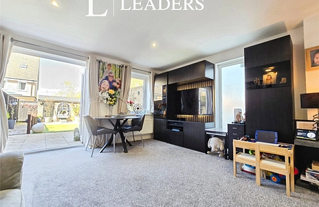 The ground floor offers an open-plan reception room with garden access and a pleasant garden view, creating a practical and social living space. A modern kitchen with good natural light sits adjacent, and there is a convenient cloakroom.