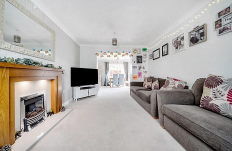 From the hall, move into the main reception room, featuring a gas fireplace with surround and a front-facing double-glazed window. This flows seamlessly into the rear extension, now used as a dining area, with a side-facing window and French doors that open directly into the garden – perfect for everyday meals or entertaining guests.
