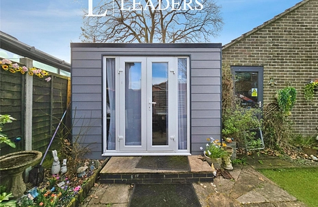 Outside, the property benefits from a south-facing private garden with side gated access, an outside office cabin and a garage with space for 2–3 cars, providing both parking and storage. Double glazing and gas central heating are installed.