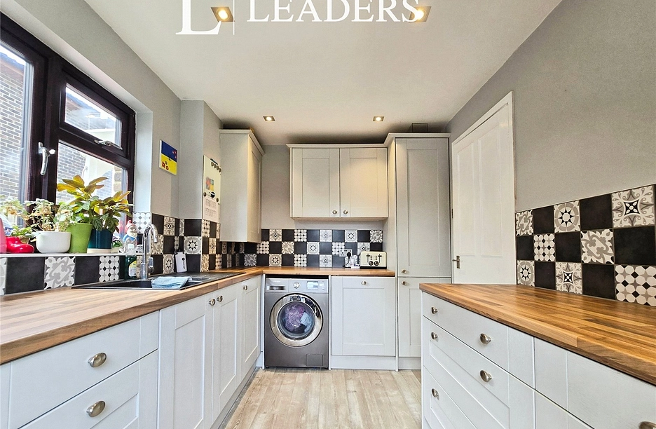 The ground floor offers two reception rooms, including an open-plan living area with large bay window, and a separate reception with dining space, garden views and direct access to the outside. The kitchen features a Shaker-style design, good natural light and a door to the garden, while a cloakroom adds day-to-day convenience. Upstairs are three double bedrooms and one single bedroom. The family bathroom is fitted with a white suite, shower over bath and a heated towel rail.