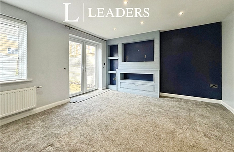 The property benefits from a sleek and contemporary fitted kitchen, featuring ample storage and generous worktop space, creating a practical and stylish area for everyday use. To the rear is a generous lounge, designed as a comfortable and inviting living space. The lounge features a media wall and is filled with natural light, with French doors opening directly onto the garden. A ground-floor cloakroom/WC adds further convenience.