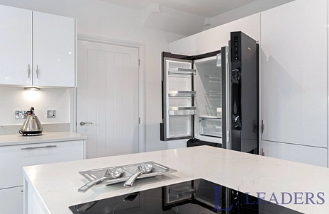 The interior is finished in crisp white tones with a select choice of carpets throughout, creating a calm and timeless aesthetic. At the heart of the home lies an expansive open-plan lounge, kitchen and dining space — a superb environment for both everyday living and entertaining — enhanced by bi-fold doors opening onto the lawned rear garden. The contemporary kitchen is fitted with premium Bosch appliances and a statement Samsung American-style fridge freezer, complemented by a separate utility room and a practical downstairs cloakroom.