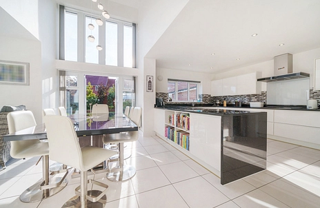 Bedrooms 1 and 4 are equipped with fitted wardrobes, offering ample storage solutions. A stunning mezzanine balcony on the first floor landing overlooks the kitchen, adding a unique architectural element to the home.