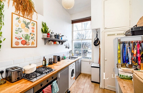 This house has a particularly handsome flat facade, with simple, elegant lines. Through the front gate and up the garden path to a solid front door. Just up to the first floor and you reach the flat's entrance. Once inside, the hall snakes around in both directions, giving you the double bedroom to the far right with a tall sash window overlooking the Grove. Next door is the reception: this too has a large window, and both rooms connect externally via a pretty Juliet balcony. Directly ahead, the bathroom is a good size with a traditional feel. The kitchen/diner is through the door on your right and is a homely space with fabulous views out to the shared gardens. A back door on the first floor staircase landing opens out to a descending iron staircase onto the grass (very lucky in a first floor pad). There are trees, shrubs and a very large lawn to scamp around in and you'll be able to have some pretty big BBQs!