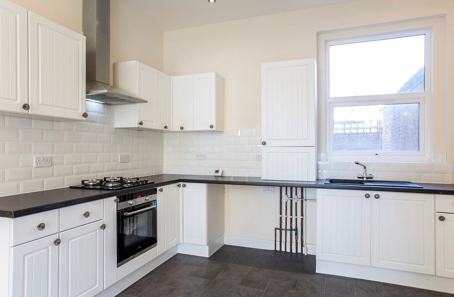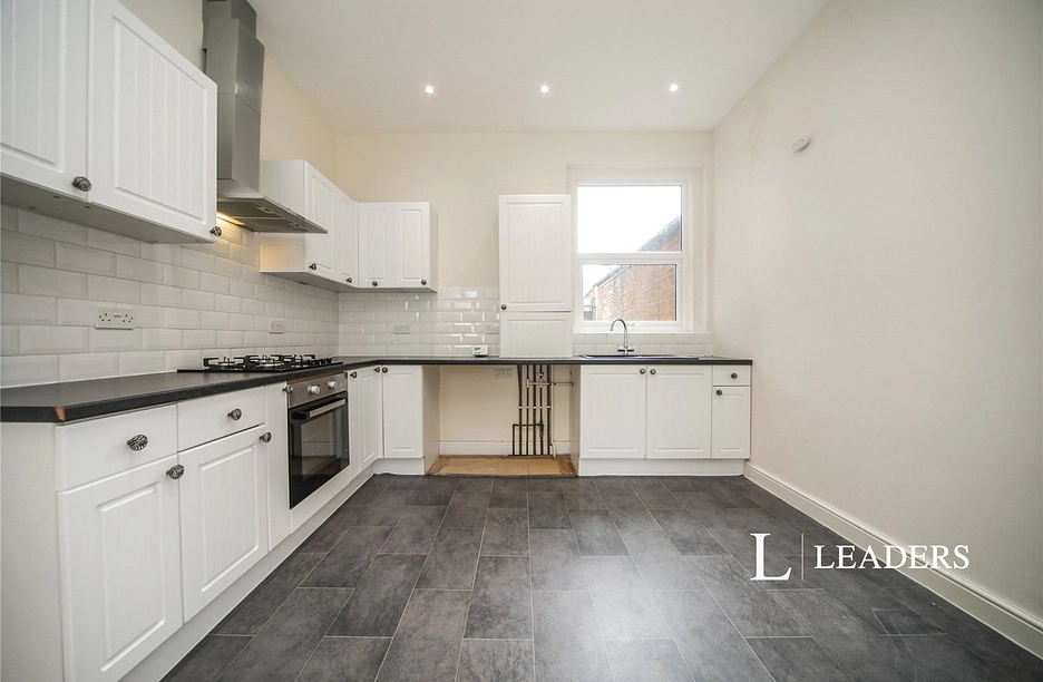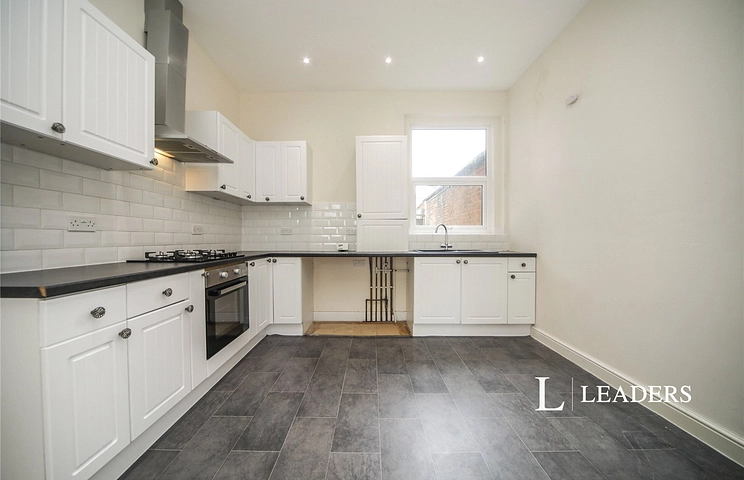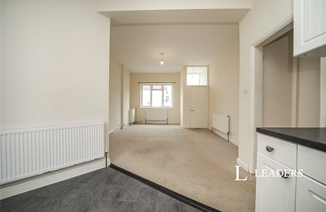 Kitchen Area - 3.76m x 3.43m (12'4 x 11'3 ) - Double glazed window to rear aspect, range of eye level and base units, rolled top work surfaces, tiled splashbacks, cupboard housing boiler.