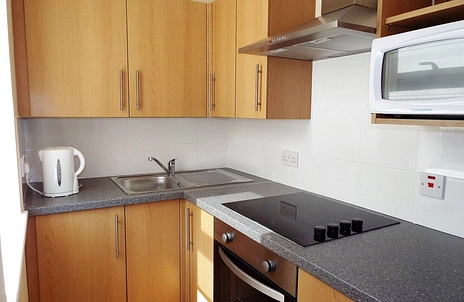 KITCHEN - window to side. Fitted with oak style cupboards with tiled splash-backs and granite effect worktops, stainless steel fridge freezer, ceramic hob with extractor over, electric oven, free standing fridge freezer (landlord will not repair or replace).
