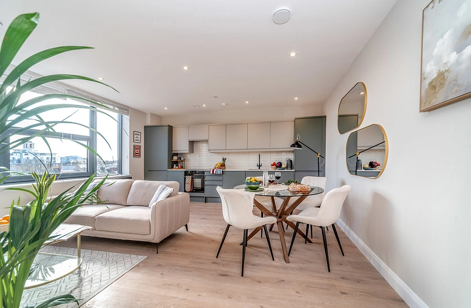 Finished to an exceptional standard throughout, this luxury apartment offers contemporary open-plan living, combining style and practicality. The sleek, modern kitchen is thoughtfully designed with high-quality integrated appliances and elegant cabinetry, seamlessly flowing into a bright and spacious living and dining area.