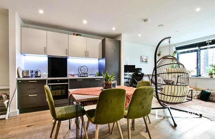 The property features an open-plan layout, featuring oakwood flooring and a combined living and dining space with a dedicated kitchen area and one reception room. There is one bathroom and one kitchen, arranged to support contemporary, low-maintenance living. Residents also benefit from a tenants’ lobby, secure bicycle storage, communal indoor clubroom and an outdoor waterfront terrace, ideal for enjoying the surrounding canalside environment.