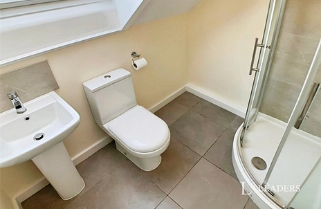BATHROOM: Three piece suite, shower cubicle, neutral decor, tiled flooring.