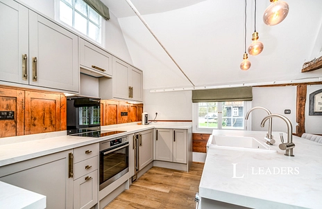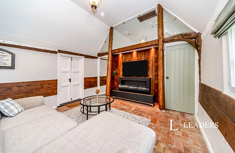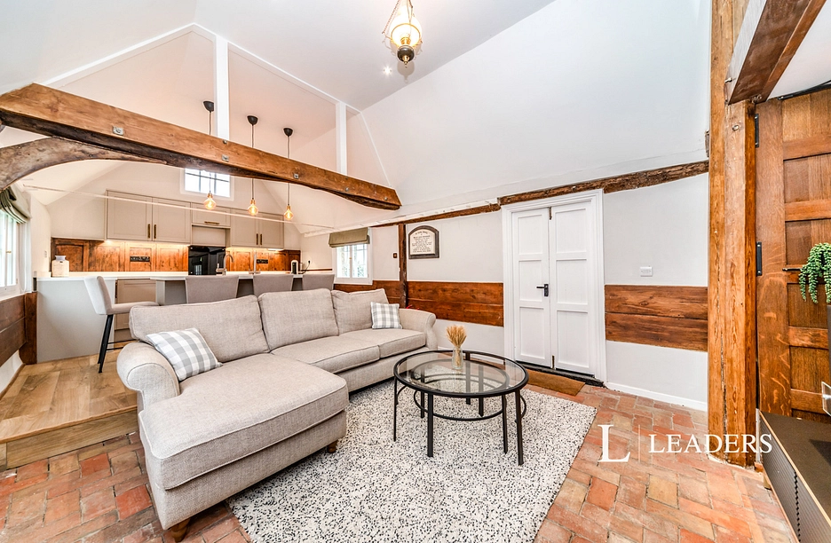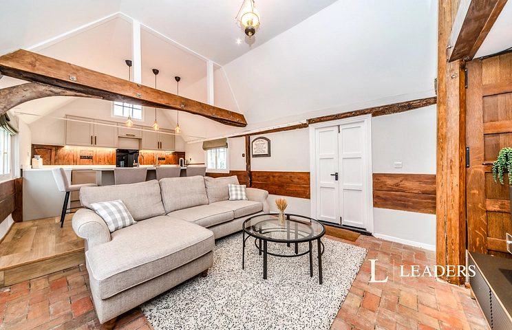 The stunning open-plan living space features vaulted ceilings and original timber framing whilst underfloor heating runs throughout, ensuring year-round comfort without compromising the building’s character.