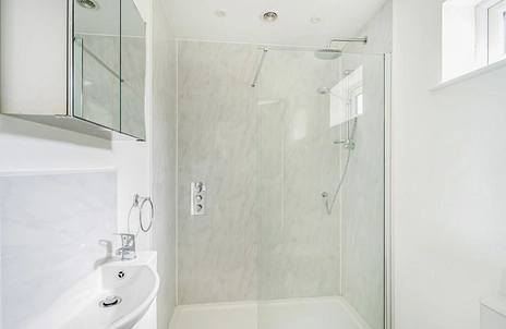 The property comprises a spacious double bedroom, a stylish modern shower room featuring a rainfall shower, and an impressive open-plan living/kitchen area. The kitchen offers ample storage and is complemented by French doors opening out to the rear garden, creating a bright and inviting living space.