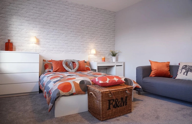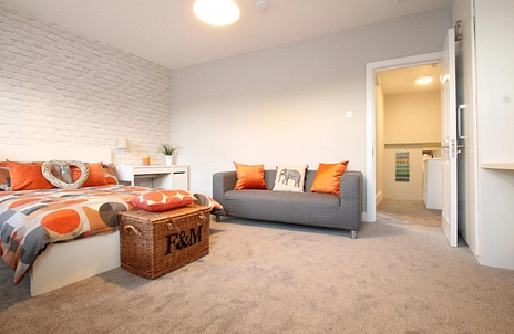 Once inside the hallway leads ahead of you. Take the stairs up to the first floor and your Room is the largest in the house spanning the entire width and is easily the master ROOM of this executive standard house share. Two large double glazed windows look out the front of the house. The décor is bang on trend in Farrow & Ball, in grey hues, and deep pile grey carpet is divine underfoot. The furniture is ready and waiting for you. The two shared shower rooms are just along the landing. Back downstairs you locate the heart of this dream home, the open plan kitchen living room. This space is cleverly thought out with quality fittings a muted matted grey kitchen with modern on trend wood style work tops. Plus you have an allocated cupboard of your own. Double fridge freezers are also provided along with a washing machine and dishwasher, oven and hob. At the rear of this space is a dining area and sofa. Double glazed French doors allow access to the paved rear garden. The garden is an ideal BBQ venue for you and your housemates to make the most of.