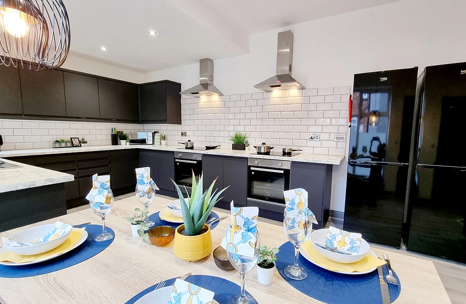Comprising of; Entrance hall, Communal lounge/ kitchen/ diner. The communal kitchen consists of two fridge freezers, two ovens and hobs, adequate storage space for all tenants, large dining table and chairs and couch with TV. There is also a further washroom with 2 washing machines and 2 dryers.