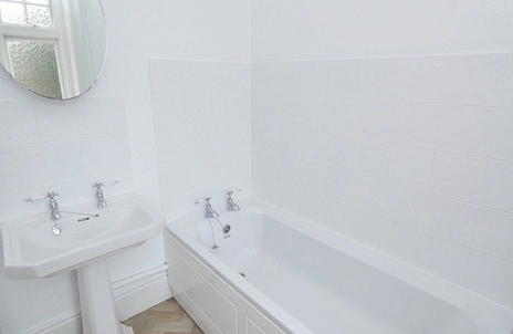 BATHROOM - Window to front aspect with radiator beneath, fitted white suite comprising bath and basin, separate shower cubicle.
