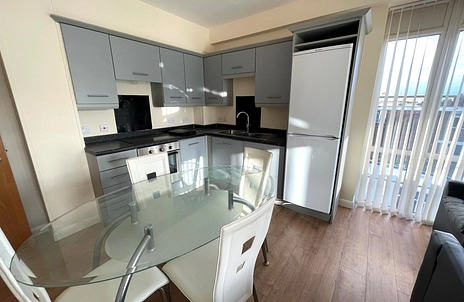 Having wall, base and drawer units with built in oven, electric hob, fridge/freezer, integrated dishwasher, dining table & chairs. Lounge area has leather sofas and tv unit, full length windows to both side and front, French doors opening to balcony over looking the city centre.