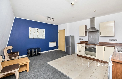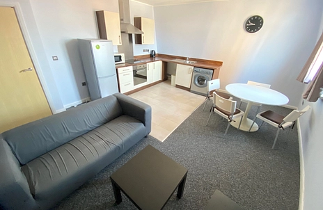 Spacious open plan living/kitchen area with the lounge area having neutral decor and carpet flooring, sofa, table and chairs, uPVC double glazed window with views over the City, electric heater. The kitchen area has neutral decor and tile flooring, range of modern wall and base units with matching roll edge work surfaces, hob/oven, extractor, washing machine, fridge/freezer.