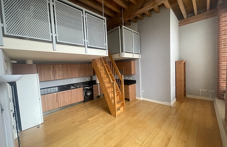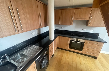 Open Plan Lounge/Kitchen - having wooden laminate flooring with full length windows, high ceilings, kitchen area has access to mezzanine
